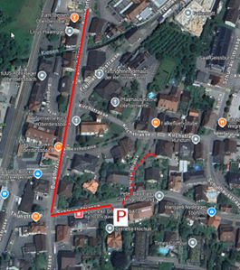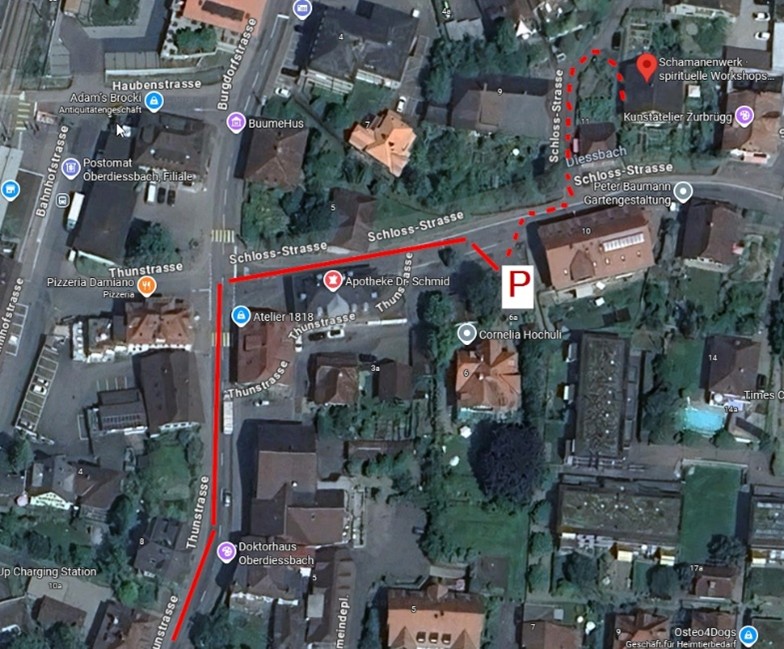Von Konolfingen her Richtung Thun. Nach dem Bahnübergang in Oberdiessbach nach ca. 400m links in die Schloss-Strasse einbiegen und den Parkplatz bei der Apotheke verwenden.