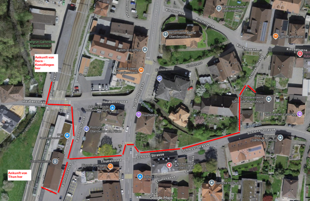 Ziel: Bahnhof Oberdiessbach anschliessend 5 Minuten zu Fuss zur Schloss-Strasse 13